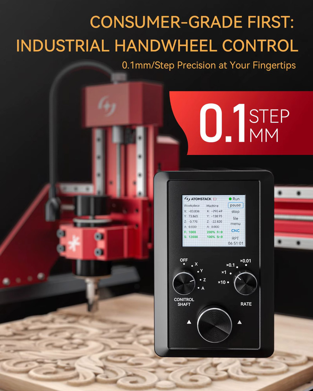 Controllo offline di livello industriale: La AtomStack C4 Pro è dotata di un controller offline industriale proprietario con manopola. Consente di osservare e correggere la posizione e di monitorare lo stato del mandrino da vicino – per un’esperienza tipica delle macchine industriali.