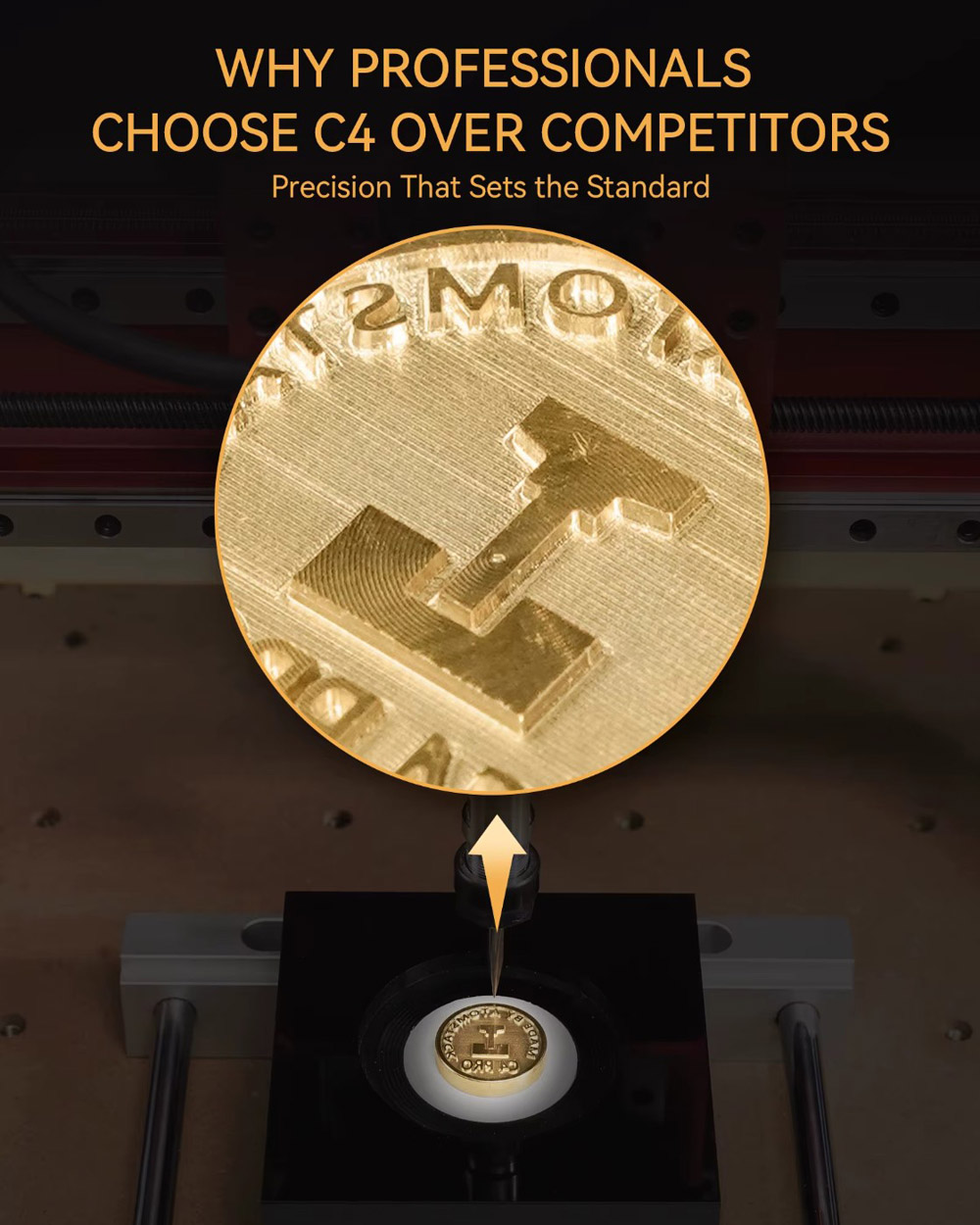 Struttura robusta: Sugli assi X e Z sono impiegate guide lineari MGH12 e viti T8 a doppia chiocciola. L’asse Y è stato rinforzato con una guida lineare da 16 mm e una vite T12 a doppia chiocciola. La C4 Pro risulta quindi non solo precisa, ma anche molto resistente e in grado di sopportare carichi elevati. Il dispositivo raggiunge una velocità massima di incisione di 2000 mm/min, permettendo, ad esempio, l’incisione di un timbro in ottone in soli 15 minuti.