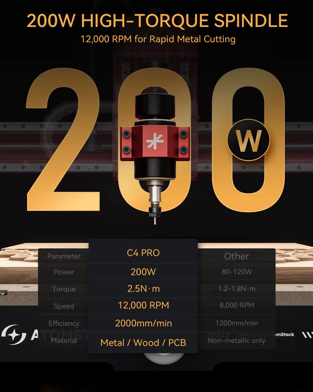 È dotata di un mandrino da 200 W con velocità massima di 12000 giri/min – consente di lavorare molti materiali: legno, PCB, acrilico, alluminio e molti altri.